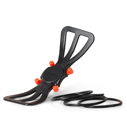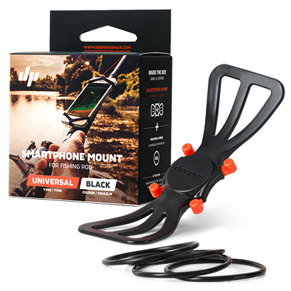 Die Deeper Smartphone Halterung passt zu allen Arten von Angelruten. Es ist ein kleines Stück Silikon mit vier orangenen Platzikhaken, die genug Halt geben, wenn Sie die Angel auswerfen und durch den Wasserstrom ziehen.