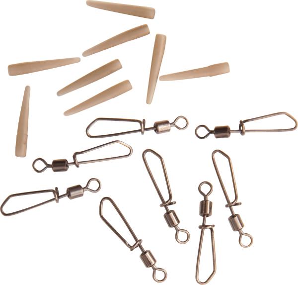 Unglaublich praktisch im Einsatz, besonders beim Abhaken eines gelandeten Fisches. Der clevere DB 'Kwik Change' Karabiner am Ende des Wirbels ermöglicht ein rasches Entfernen des Stahlvorfaches noch im Kescher. Schonend für den Fisch und die Montage. Das Kit besteht aus dem Kwik Change Swivel und den dazu passenden Safety Sleeves, die sich wie eine zweite Haut um die einzelnen Elemente der Montage legen. Die DB 'Safety Sleeves' haben eine helle Sand-Camo-Farbe und passen sich perfekt an unser Camo-Vorfachmaterial an.