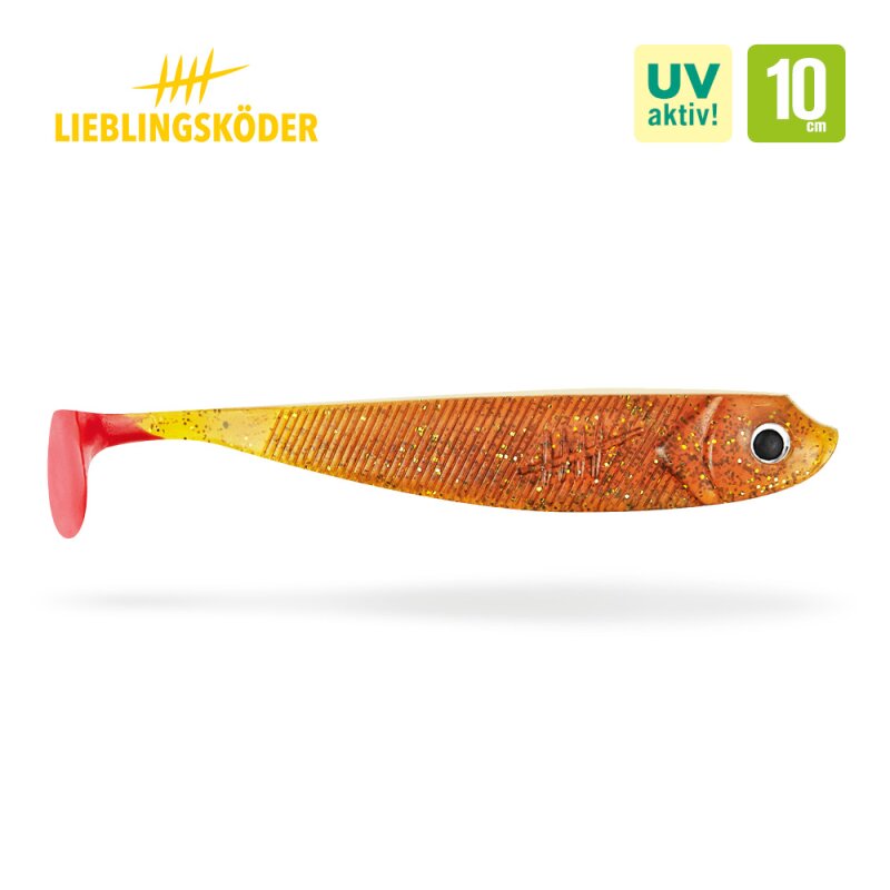 Unsere 10 cm Lieblingsköder sind ideal, um mittlere und große Zander und Hechte zu fangen. Die extra weiche und flexible Gummimischung kann von den Raubfischen ohne großen Widerstand eingesaugt werden und minimiert dabei die Gefahr von Fehlbissen. Die hochfrequenten Schwanz-Bewegungen imitieren bei schnellem Zug einen Beutefisch auf der Flucht, dabei unterstützt die Form des Körpers den Lauf des Köders und der Körper entwickelt eine leichte Flankbewegung.