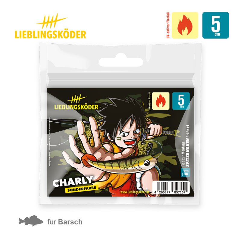 Der Gummiköder Charly hat ein filigranes Linienmuster auf den Schuppen und ist im Wasser von einem echten Barsch kaum zu unterscheiden. Eingearbeitet ist ein UV-Effekt auf beiden Seiten, zu sehen an den gelb-grünen Streifen an den Flanken. Das orangefarbene Schwanzende macht den Gummiköder besonders fängig.