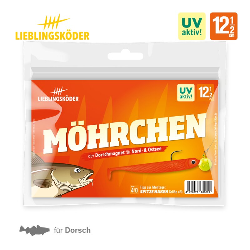 Der Gummiköder Möhrchen ist ein neon-oranger Gummifisch mit extremer UV-Aktivität und wurde ursprünglich speziell für das Dorschangeln entwickelt. Funktioniert aber auch super beim Raubfischangeln in trübem Wasser und darf in keiner Box fehlen.
