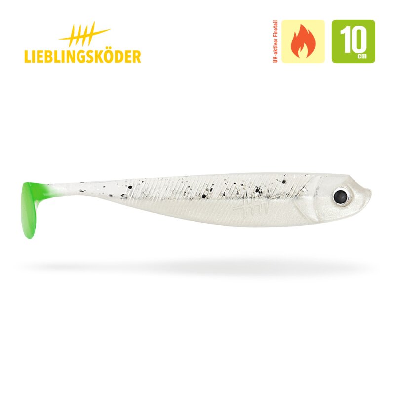 Der Gummifisch Sunny Lemon ist in seiner Grundfarbe an unseren Gummiköder-Klassiker angelehnt. Seine helle Grundfarbe und der glitzernde Rücken machen jeden Raubfisch wild. Der grüne UV-aktive Schwanz ist mit seiner von Lieblingsköder üblichen natürlichen Schwanzbewegung ein weiterer Fixpunkt für Raubfische.