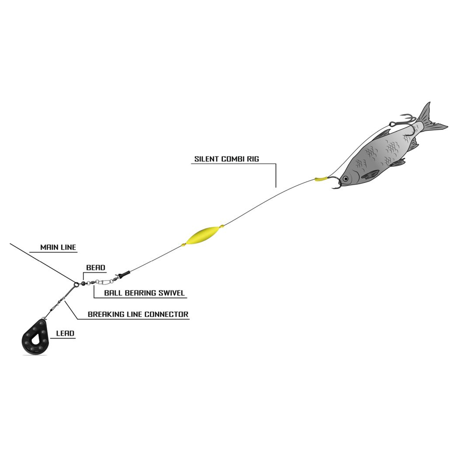 Das Black Cat Silent Combi Rig Waller Spezial Fertigvorfach eignet sich hervorragend für die Präsentation von Köderfischen und anderen Naturködern knapp über Gund an stark beangelten Gewässern.
